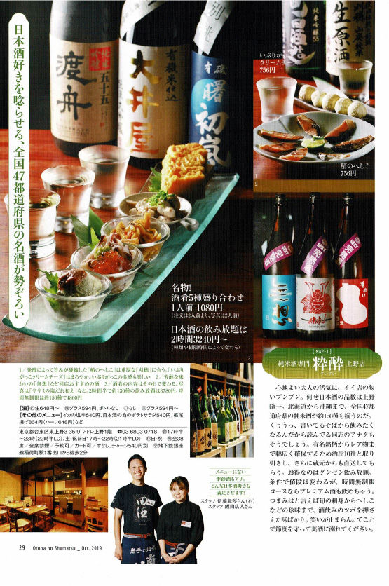 粋酔上野店が雑誌「大人の週末」2019年10月号に掲載されました。
